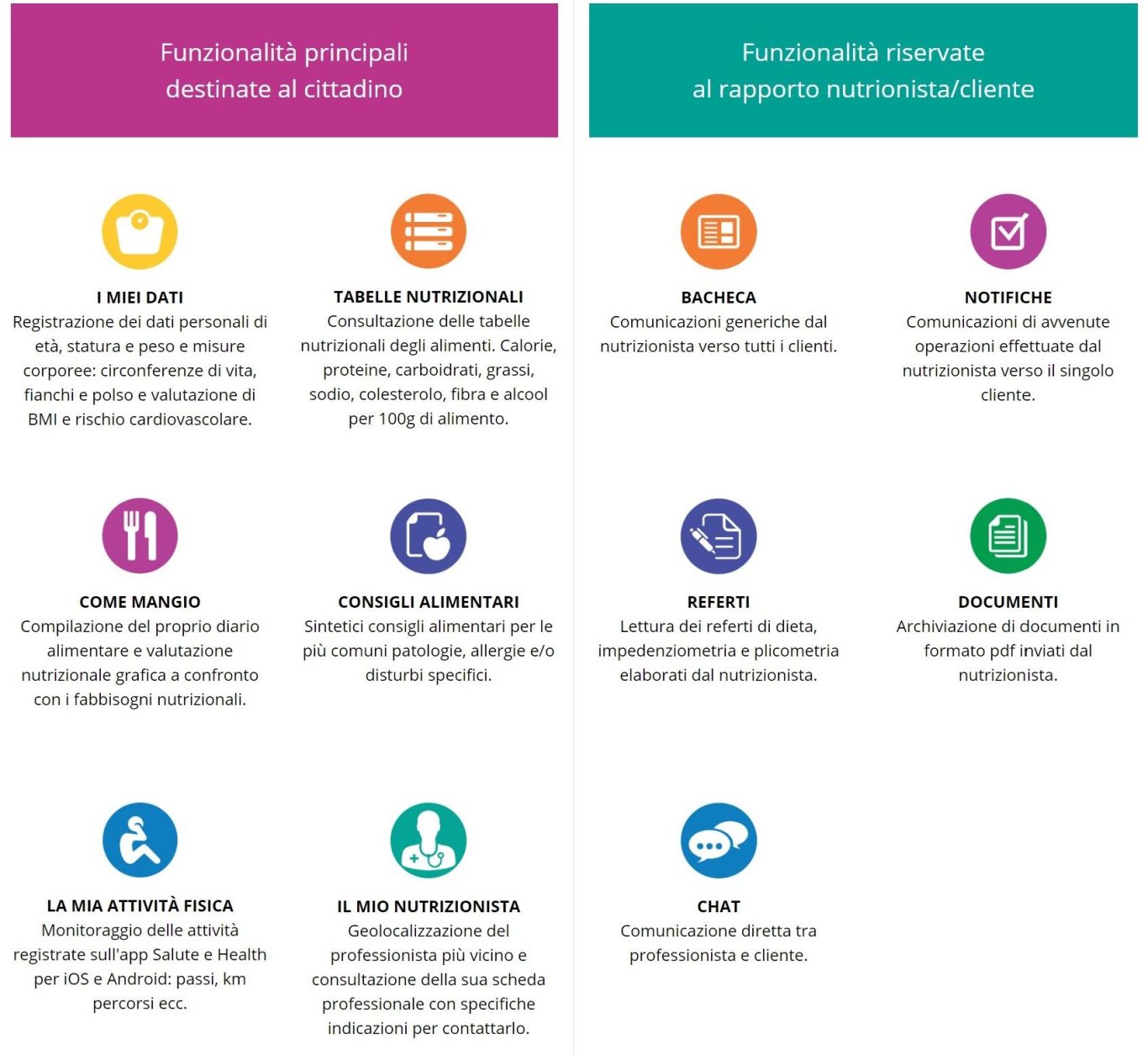 Un consulente sicuro per il cittadino e uno strumento concreto per il nutrizionista che desidera fidelizzare il cliente, aumentare la sua visibilità e rendere la prestazione ancora più esclusiva.